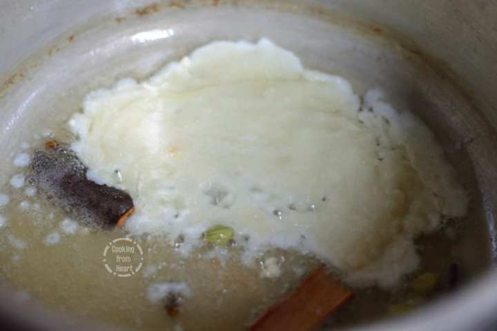 2. In a pressure cooker, heat oil. Add cloves, cardamom, cinnamon and let them splutter.