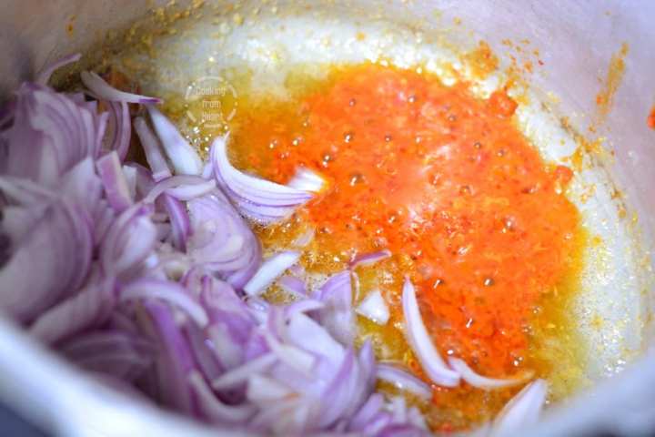 - Now add sliced onions and red chilli paste. Cook until the onions are translucent and the red chilli paste is cooked.
