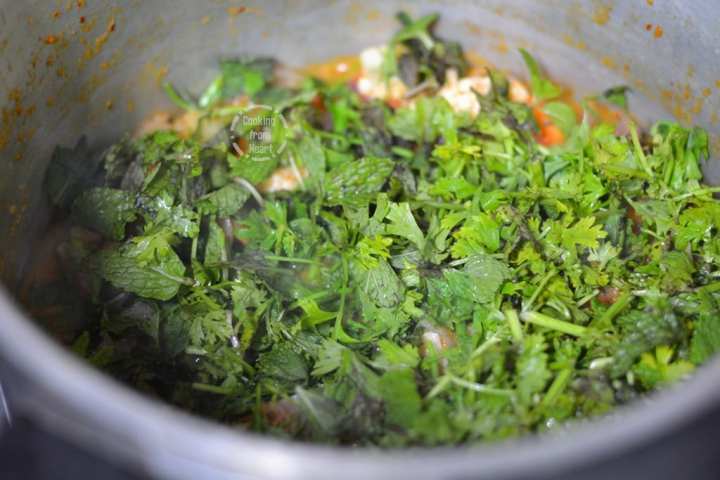 - Add chopped coriander and mint leaves. Cook for a couple of minutes.