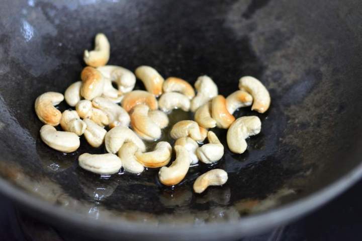 - In a thick bottomed pan heat 2 teaspoon oil and roast 15-20 cashews until golden. Remove and set them aside.
