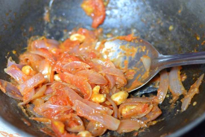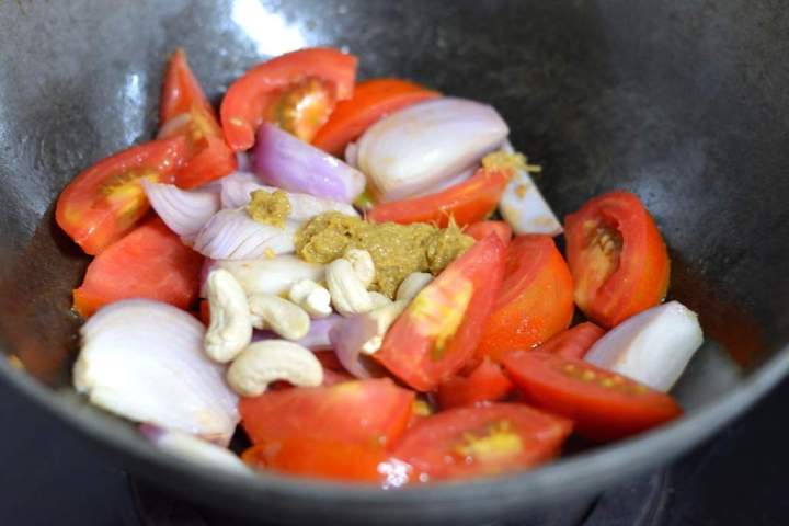 In the same pan, add 2 medium onions and 3 medium tomatoes roughly chopped along with 1 teaspoon ginger garlic paste and 4-5 whole cashews.