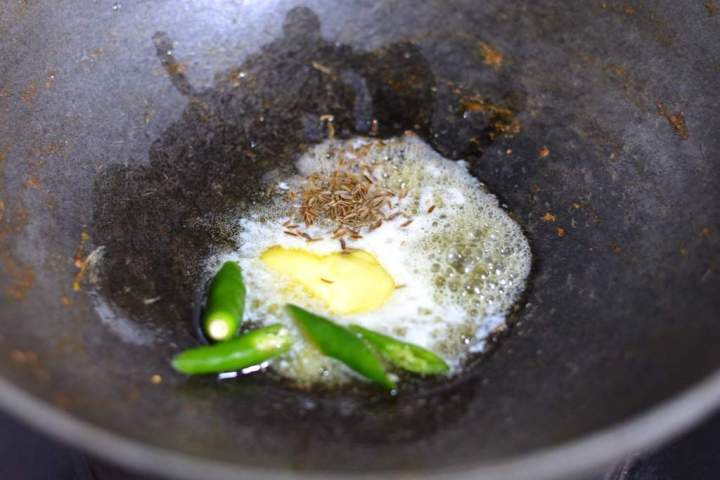 In the same pan, heat 1 tablespoon butter. Add ½ teaspoon shahi jeera and 1-2 green chillies slit.