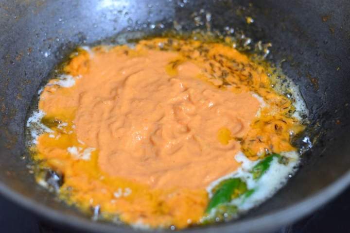 - Now add the prepared onion tomato paste, add some water as needed and cook for a couple of minutes.
