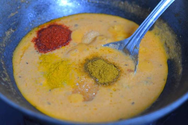 - Next add ½ tablespoon Kashmiri red chilli powder, ¼ teaspoon turmeric powder, ½ teaspoon garam masala powder, 1 teaspoon sugar and salt as needed.
