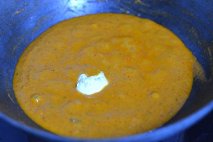 - Cook the curry on low flame for 7-8 mins until it gets thick and creamy. Now add 1 teaspoon fresh cream (alternatively use a dash of milk) and mix well, cook for a couple of minutes.