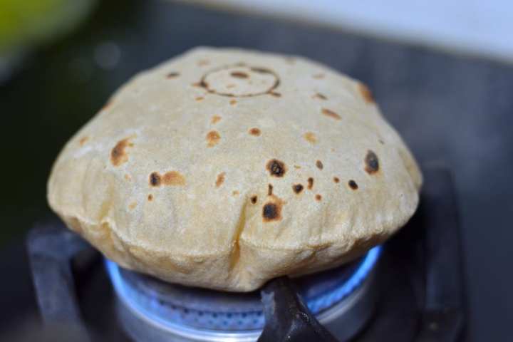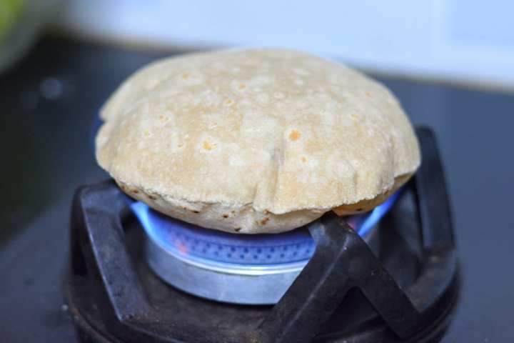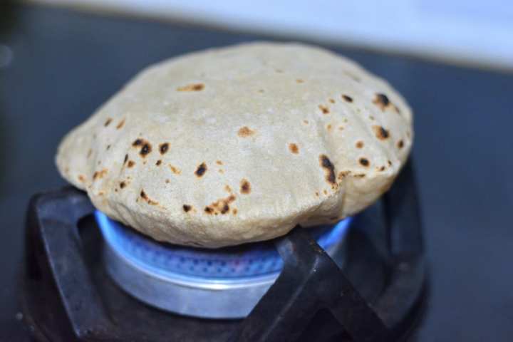 - In next 30-40 secs, the fulka will puff up to its fullest. Carefully lift and flip it, cooking the other side for 10 secs.