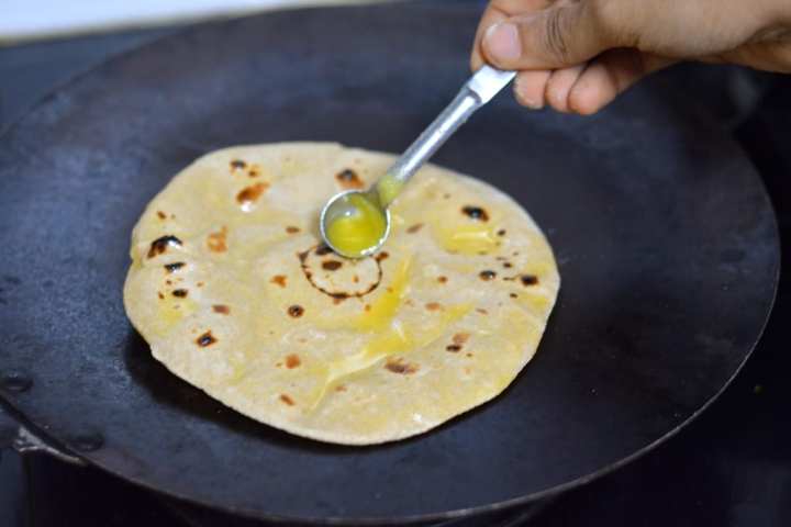 - Place it back on the tawa or a plate, spread homemade ghee or oil. Repeat this with rest of the rolled out fulkas and stack the cooked ones on top of the other. Place them between tissue papers/cotton cloth in a box or hotpack to retain freshness and softness for many hours after making.