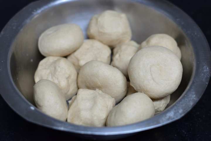Divide the dough into small balls, equally sized. Roll the balls of dough between your palms to make it even and smooth.