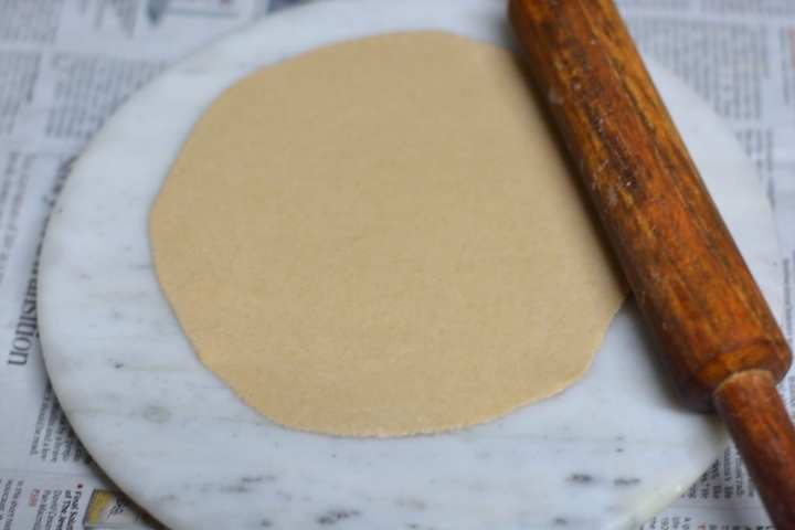 - Take a ball of dough, dust it in whole wheat flour and roll it into disc of ~10cm diameter and it should be about 1mm in thickness. Dust with flour if it sticks to the rolling pin. Repeat this with rest of the dough, keeping each rolled out fulka on a newspaper or plate, not sticking with each other.