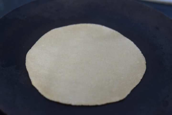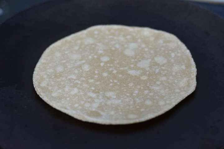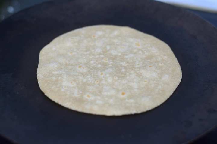 - Meanwhile heat a tawa on medium flame. Once hot, put a rolled out fulka. Cook for 10 secs and then flip.