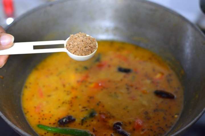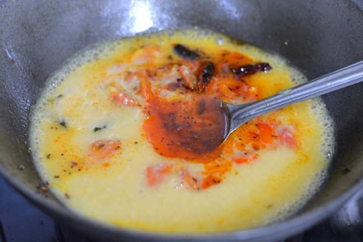 - As the tomatoes begin to turn mushy, add mashed dal. Add ½ cup of water, slit green chilli and let it come to a slow boil.