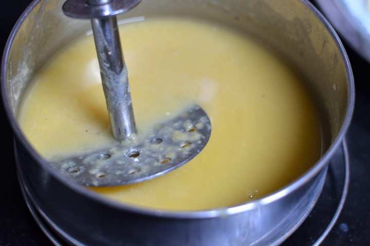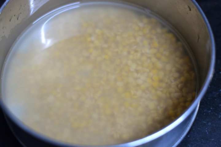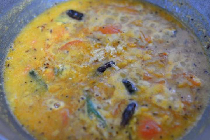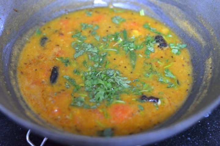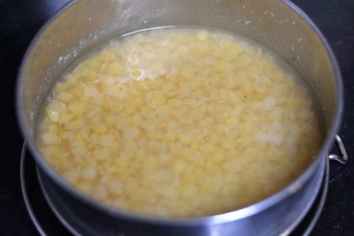 - Wash and drain off toor dal. Add enough water and pressure cook it for 3-4 whistles until it is well cooked.