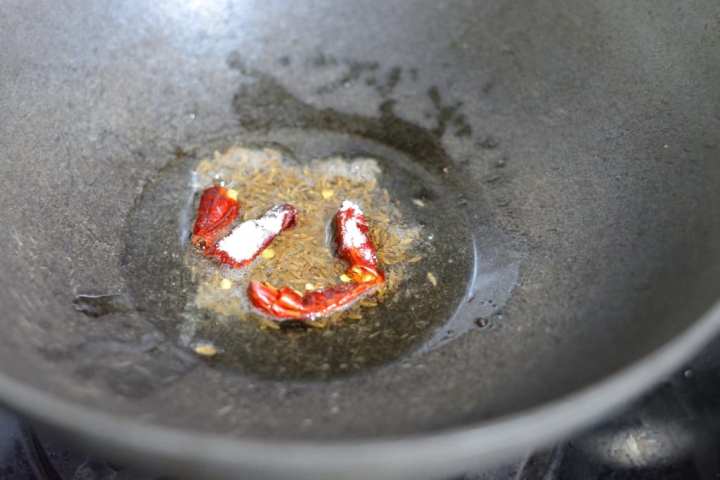 - In a thick bottomed pan, heat oil and ghee. Add mustard seeds, cumin seeds, dried rec chillies torn to small pieces.
