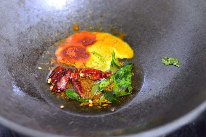 - As the splutter add fresh curry leaves. Finally add asafoetida, red chilli powder and turmeric powder. Fry for a few seconds.