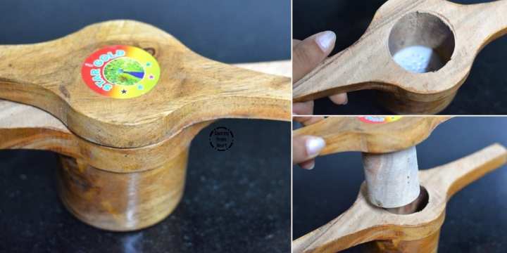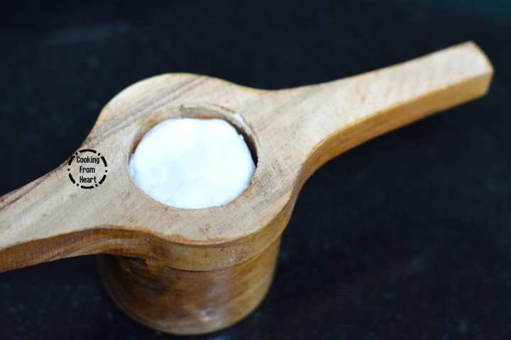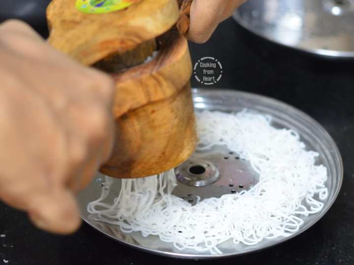 Idiyappam or Nool Puttu as it is called in Kerala, is steamed rice string hoppers. A special naazhi/press is used to make the idiyappam and I recently got a traditional wooden one. While it is not the easiest task to press the rice dough through the press, when the consistency is right – it works like a charm. There are different types of presses available – choose the one that works for you.