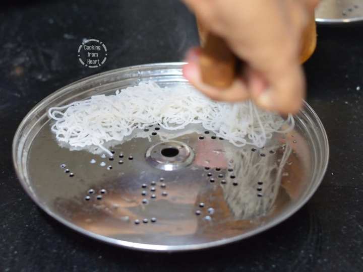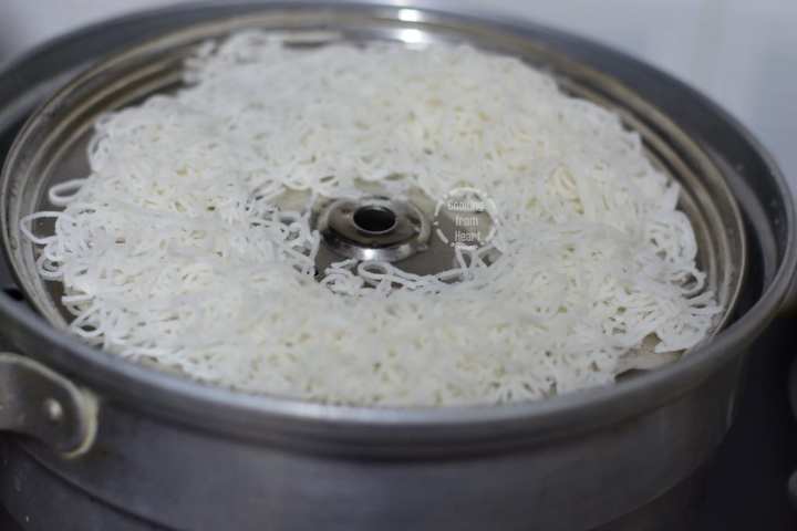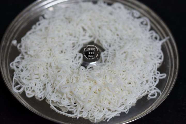 - Place the idiyappam plate in a steamer or idli cooker for 3-4 mins or until the idiyappam is bouncy.