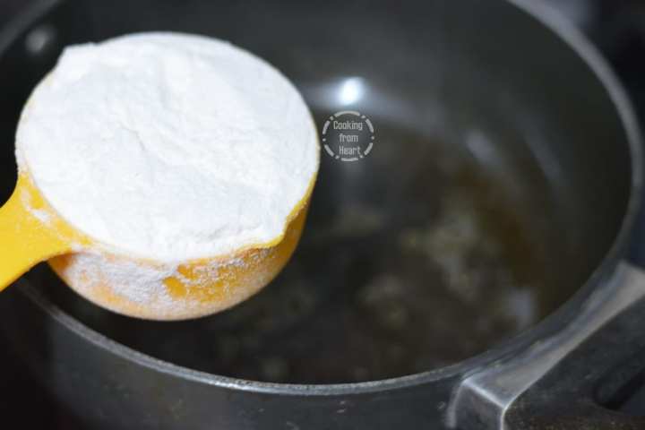 2. As the water comes to a rolling boil, switch off the heat and add rice flour.