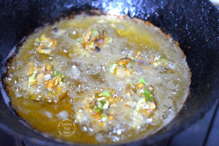 - For deep frying mushroom pakodas - heat oil in a pan. Once hot, drop small lumps of the prepared mixture into oil. Don’t overcrowd the oil and fry the pakoda on medium flame until golden brown.