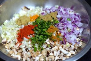 - In a mixing bowl add 2 cups finely chopped mushrooms, 2 cups chopped cabbage, 1 small onion sliced, ½ teaspoon ginger garlic paste, ¼ cup finely chopped coriander leaves, 1 teaspoon Kashmiri red chilli powder, ½ teaspoon coriander powder, ¼ teaspoon turmeric powder, ¼ teaspoon garam masala powder and salt as needed.
