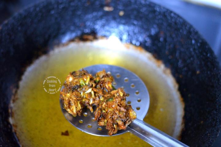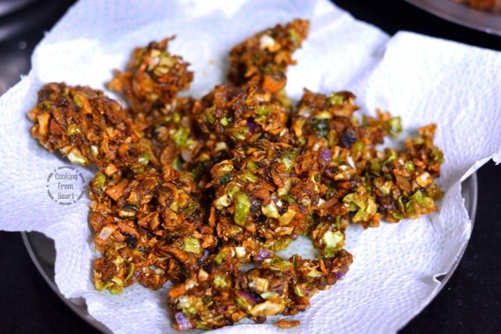 - Drain off the excess oil and set them on a kitchen tissue. Repeat it with rest of the mixture.