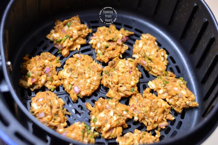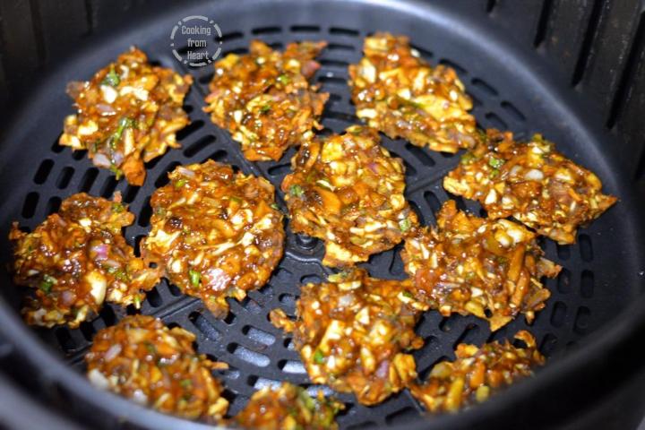 - Half way through the time, after 6 mins coat the pakodas with a layer of oil on both sides and continue air frying for 6 more minutes. Repeat the process with rest of mixture, if needed.