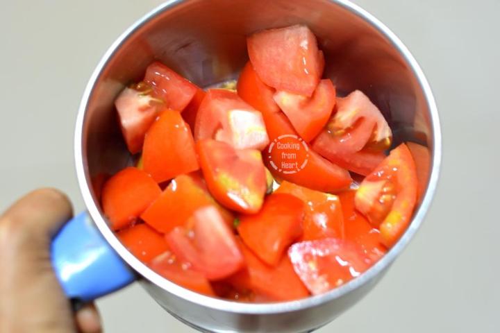 As the oil oozes out from the sides of the pan, add prepared tomato puree. Cook it on low flame covered for 5-7mins.