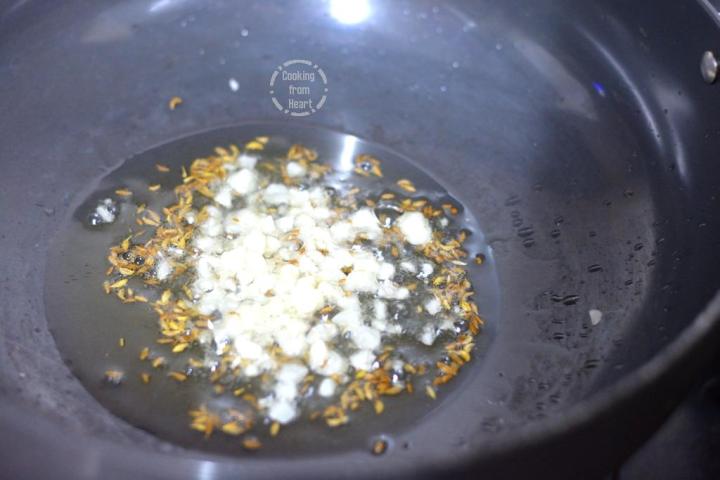 In a pan heat 2 tablespoon oil and splutter ½ teaspoon fennel seeds followed by 6-8 garlic pods finely chopped.