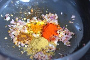 - Quickly add ¼ cup of water and cook the spice powders for 2-3 mins.
