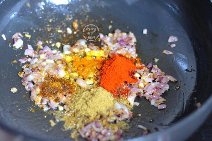 Quickly add ¼ cup of water and cook the spice powders for 2-3 mins.