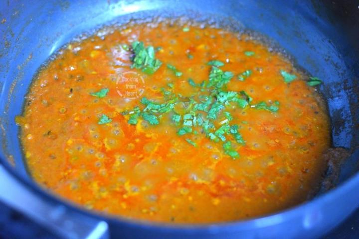 - As oil floats on top, add few fresh coriander leaves finely chopped and remove from heat.