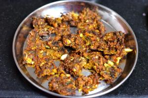 - Place a few mushroom cabbage pakodas on the serving plate. If they are large, roughly tear them into bite sized pieces.