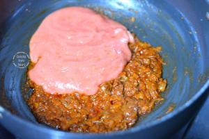 - As the oil oozes out from the sides of the pan, add prepared tomato puree. Cook it on low flame covered for 5-7mins.