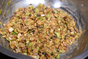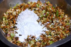 - Mix it well and set it aside for 5 mins. Mushrooms, cabbage and onions leave water when mixed with salt.