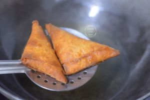 - Maintain the temperature of the oil at all times and don’t overcrowd with many samosas at once.