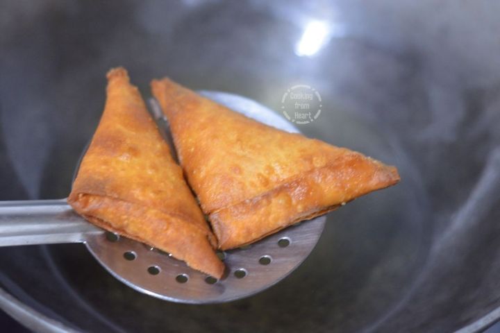 The temperature of the oil is very important to get crispy and golden samosas that are cooked all the way through. If the temperature of the oil is too low, the samosas absorb a lot of oil and if the temperature is too hot, the samosas change color quickly without retaining the crispness or not getting cooked through out. Make sure the oil is hot and then keep it on low flame, maintaining the temperature for each batch of frying.