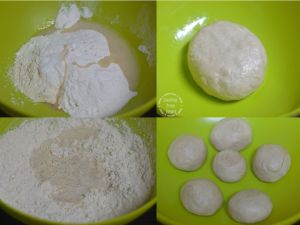 - To prepare the dough, mix ½ cup whole wheat flour with ½ cup all purpose flour, 2 teaspoon hot oil, salt as needed. Mix well until the oil is incorporated and add water little by little. Knead into a smooth dough that is pliable. Rest it for 10 mins. Make equal sized balls from the dough.