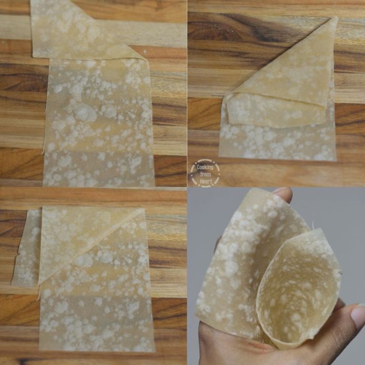 - To prepare the samosa, take a patty sheet, place the cooked side facing up and fold it into a triangle from one end. Make two more folds and there should be a triangular cavity to fill the stuffing.