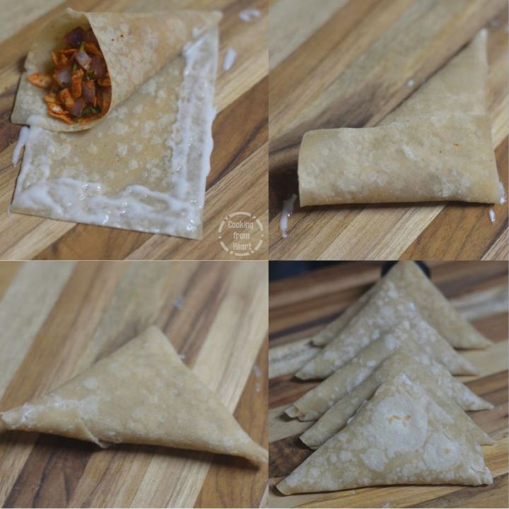 Place 1-2 tablespoon of prepared onion stuffing. Along the edges, apply the prepared paste to seal the edges. Close the samosa and make sure all edges are tightly sealed. Repeat this with all the samosa patties.