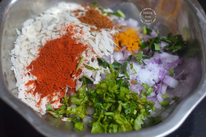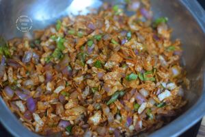 Meanwhile prepare the stuffing by adding 1 large onion finely chopped with ¼ cup poha, ½ tablespoon Kashmiri red chilli powder, ¼ teaspoon turmeric powder, ¼ teaspoon garam masala powder, salt as needed and 3 tablespoon finely chopped coriander leaves.