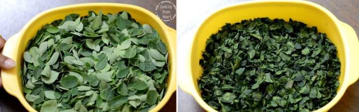 - Clean Moringa leaves and remove the stalks completely. Make sure there are no stems/stalks. Wash and pat dry Moringa leaves/Murungai Keerai making sure there is no moisture.