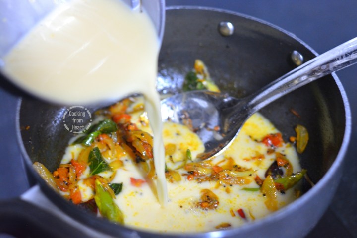When serving with poori or chapati, we always add mixed vegetables like carrots, beans, potatoes and green peas – cook them before adding gram flour slurry.