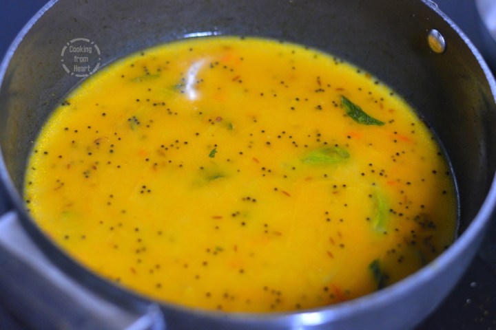 In a pan heat 2 teaspoon oil and add ¼ teaspoon mustard seeds, ¼ teaspoon cumin seeds. As they splutter, add ¼ teaspoon asafoetida/hing, few fresh curry leaves along with 1 teaspoon grated ginger, 1-2 green chillies slit across, 1-2 dry red chillies cut into halves. Fry for a few seconds.