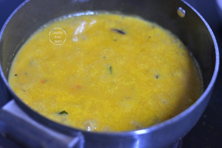 Cook on low flame after the gram flour slurry is added and mix continuously to avoid lumps from forming. Gram flours thickens quite fast, so it is important to keep a close eye and mix/stir frequently.