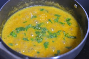 As it turns thicker and coats the back of the spoon, check if the raw smell of the besan is gone. If not, add some water and continue cooking for a few minutes. Finally add 2 tablespoon finely chopped coriander leaves/cilantro. Remove from heat.