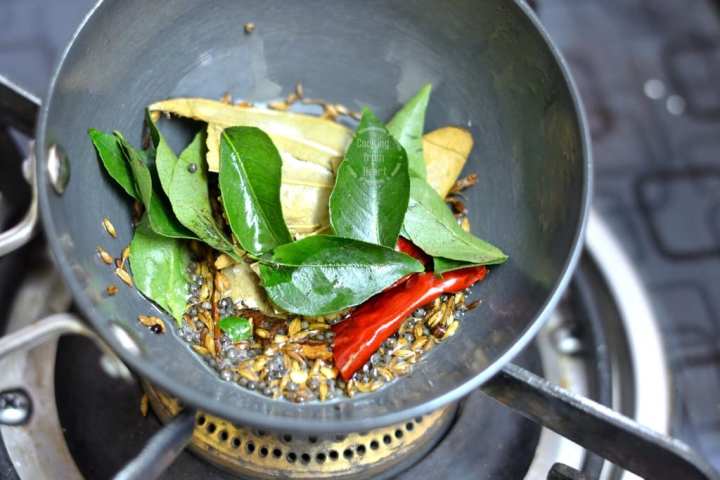 - In a small pan, heat 2 teaspoon of oil. Add mustard seeds, cumin/jeera seeds, dried bay leaf, dried red chilli and everything begins to pop, add asafoetida and fresh curry leaves. Remove from heat.