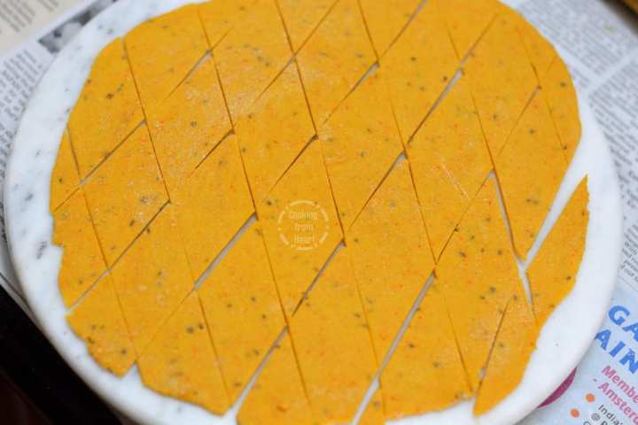 3. Cut it into desired shape and size. Repeat this with rest of the dough and set the cut pieces aside.