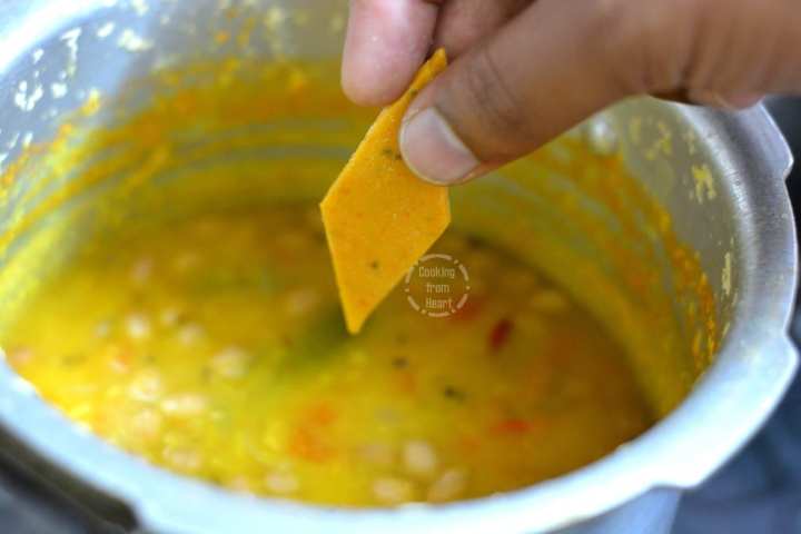 2. Once the pressure drops, remove the pressure cooker lid and gently mash the dal.