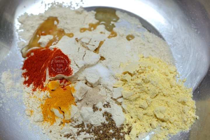 1. In bowl, add whole wheat flour, besan/gram flour, red chilli powder, turmeric powder, ajwain, salt and oil.