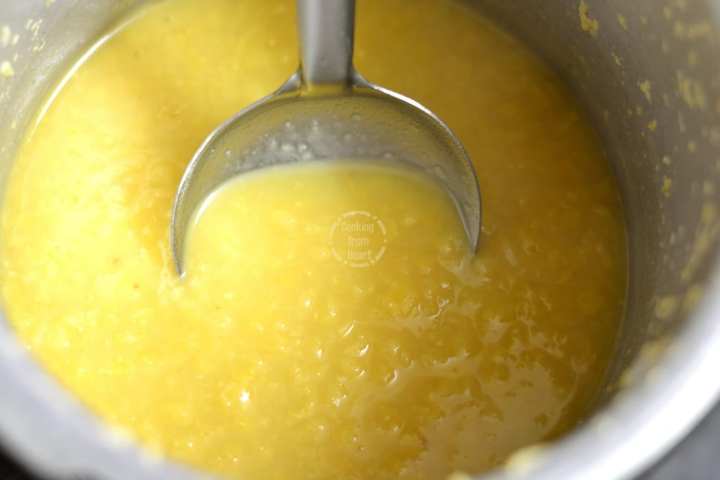 - Once the pressure drops, remove the pressure cooker lid and gently mash the dal.
