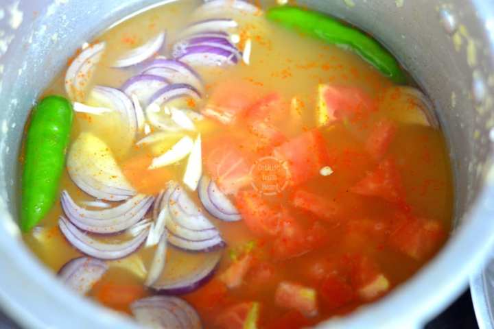 3. Add chopped onions, tomatoes, cut green chillies, red chilli powder, turmeric powder – let this come to a boil on medium flame.